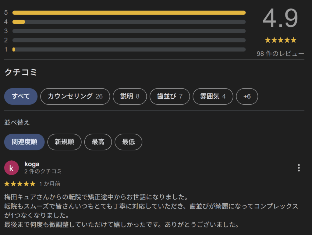 ネットで公開されていた札幌矯正歯科の口コミを紹介します。歯科の口コミサイトは、「日本歯科医療評価機構」「teech」とありましたが、今回は1番口コミの投稿が多いGoogle口コミを見てみました。